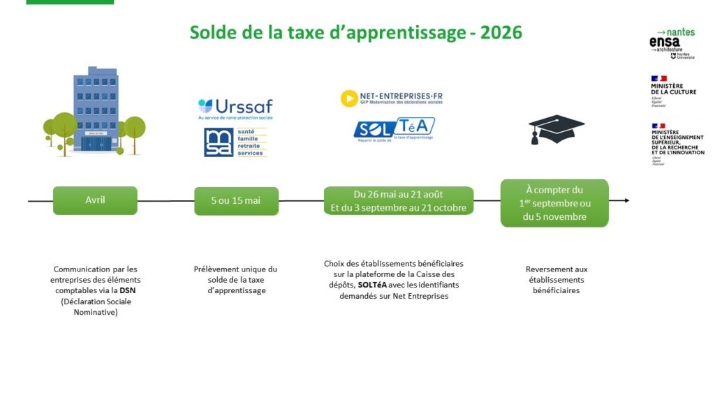 En 2026, le solde de la Taxe d’apprentissage est toujours collecté directement par l’URSSAF par un prélèvement ACOSS/MSA sur la base des éléments déclarés sur la DSN (Déclaration Sociale Nominative) d’avril. Il représente 0,09% de la masse salariale de l’année précédente.